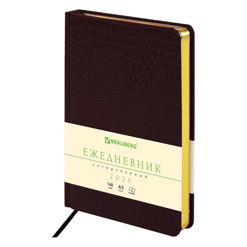 Датированный ежедневник BRAUBERG "Comodo" с обложкой, стилизованной под крокодиловую кожу, отличается изысканным внешним видом.Внутренний блок включает 168 листов тонированной бумаги плотностью 70 г/м2. Каждая страничка имеет перфорированный угол. Благодаря стандартному формату А5 (138х213 мм) ежедневник удобно использовать как в офисе, так и на выездных деловых встречах. Материал обложки благородного коричневого цвета подходит для горячего тиснения. Срез ежедневника украшен золотым фольгированием – это подчеркивает премиальность изделия.