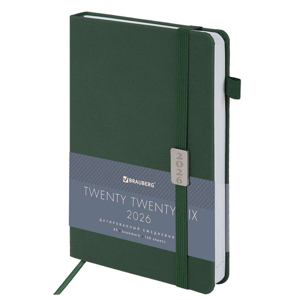 Ежедневник датированный 2026, А5, 138x213 мм, BRAUBERG "Control", под кожу, держатель для ручки, зеленый, 117123