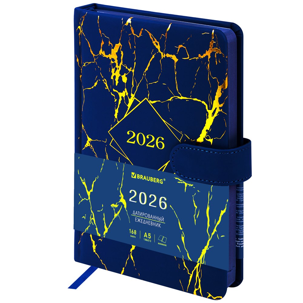 Ежедневник датированный 2026 А5 138x213 мм, BRAUBERG "Goldy", под кожу, цветной срез, синий, 117472
