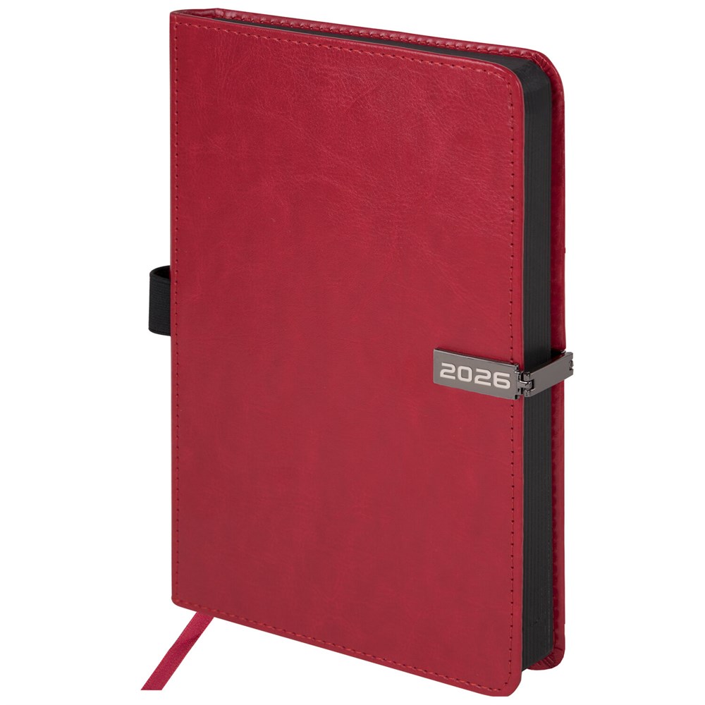 Твердая обложка стилизована под гладкую кожу красного цвета. Материал обложки подходит для горячего тиснения. Для удобства пользования ежедневник снабжен держателем для ручки. Цветной срез в контраст обложки придает ежедневнику особый шарм. Дополнением является закладка-ляссе, с помощью которой при необходимости можно быстро открыть ежедневник на нужной странице. Ежедневник снабжен обширным справочным материалом. В конце есть 4 страницы для записей и заметок.