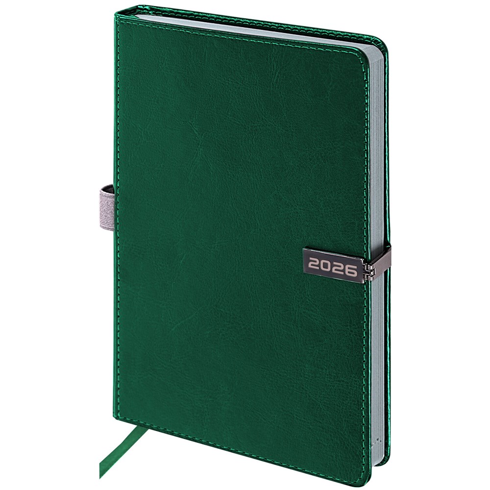 Твердая обложка стилизована под гладкую кожу темно-зеленого цвета. Материал обложки подходит для горячего тиснения. Для удобства пользования ежедневник снабжен держателем для ручки. Цветной срез в контраст обложки придает ежедневнику особый шарм. Дополнением является закладка-ляссе, с помощью которой при необходимости можно быстро открыть ежедневник на нужной странице. Ежедневник снабжен обширным справочным материалом. В конце есть 4 страницы для записей и заметок.