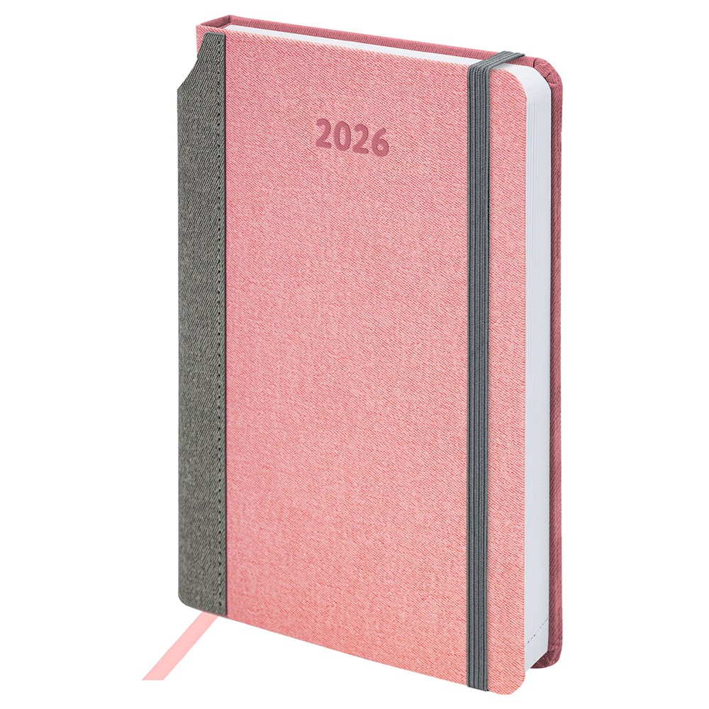 Выполнен в стильном сочетании розового и серого цветов. Жесткая книжная обложка стилизована под искусственную кожу с текстурой льна, фиксируется резинкой, поэтому ежедневник не откроется в сумке или портфеле и страницы не помнутся. Материал обложки подходит для горячего тиснения. Для удобства пользования ежедневник снабжен карманом для фиксации ручки. Дополнением является закладка-ляссе, с помощью которой при необходимости можно быстро открыть ежедневник на нужной странице.