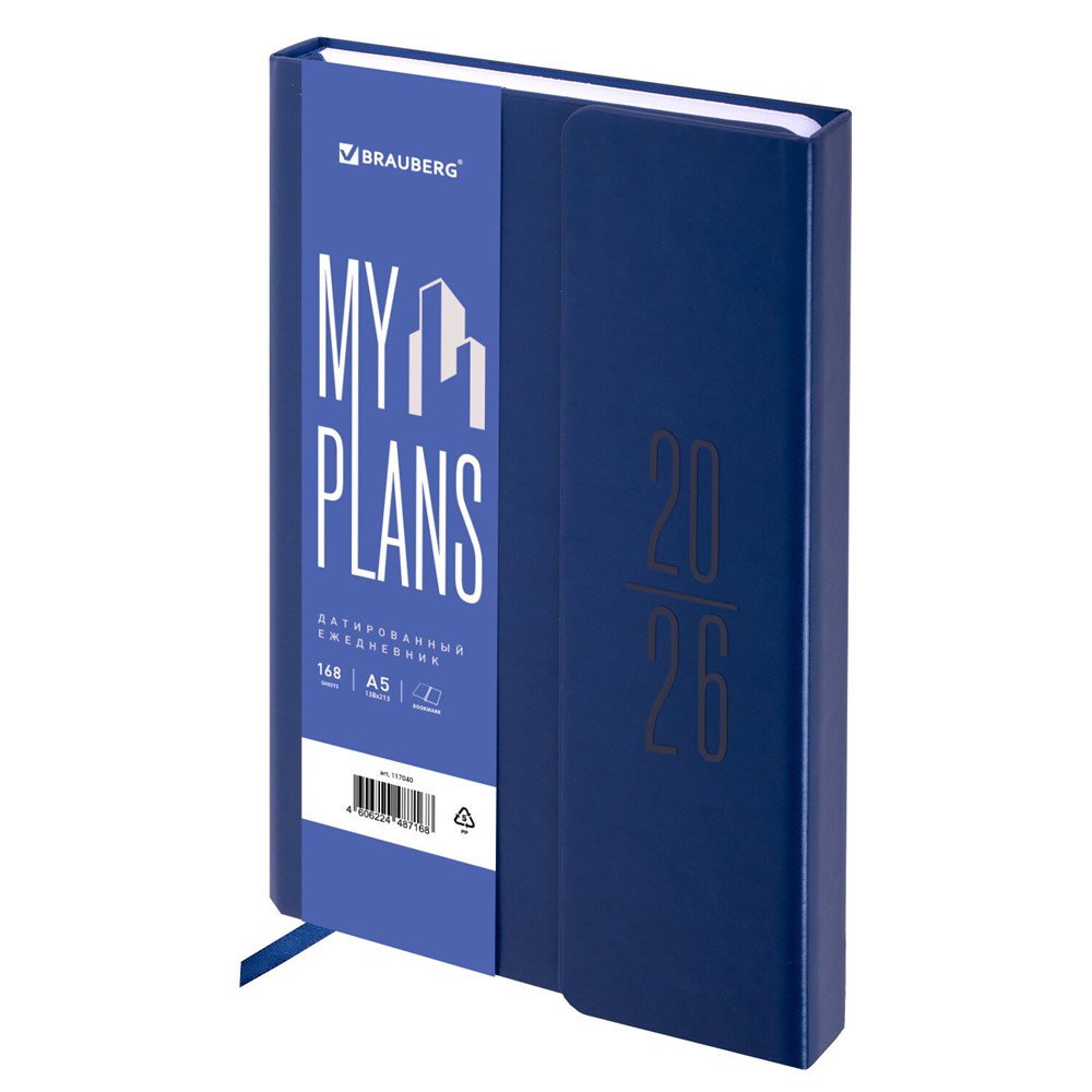 Ежедневник датированный 2026, А5, 138x213 мм, BRAUBERG "Towny", под кожу, клапан, синий, 117040