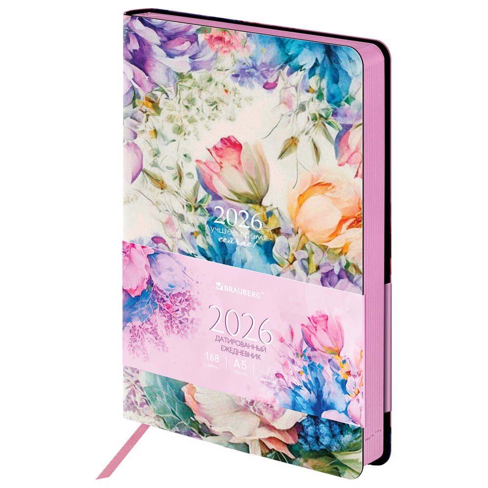 Ежедневник датированный 2026 А5 138x213 мм, BRAUBERG "Vista", под кожу, гибкий, "Цветы", 117447