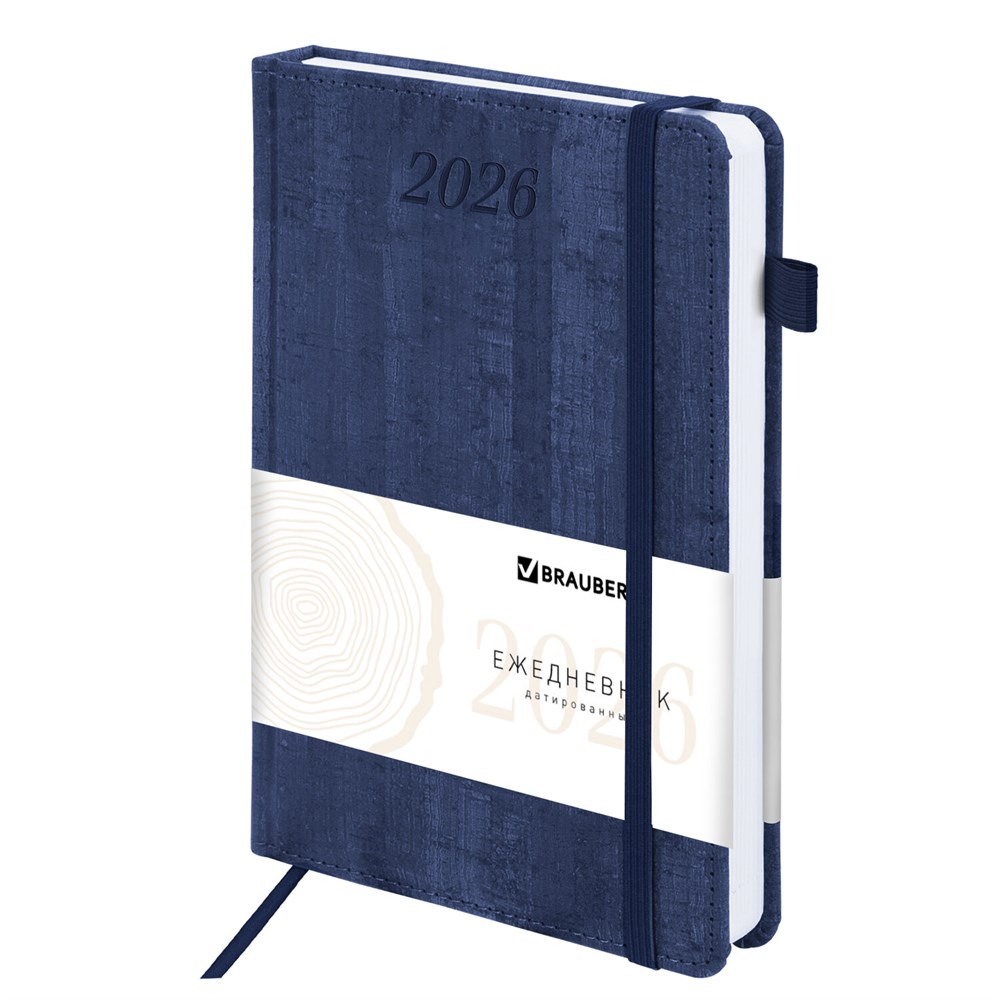 Ежедневник датированный 2026 А5 138x213 мм, BRAUBERG "Wood", под кожу, держатель для ручки, синий, 117106