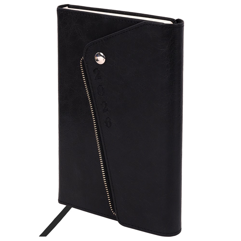 Твердая обложка стилизована под текстурную кожу и имеет интересную деталь в виде магнитного клапана декорированного молнией и кнопкой. Благодаря клапану ежедневник не откроется в сумке или портфеле. Подходит для горячего тиснения. Дополнениями являются закладка-ляссе, с помощью которой при необходимости можно быстро открыть ежедневник на нужной странице, и держатель для ручки.