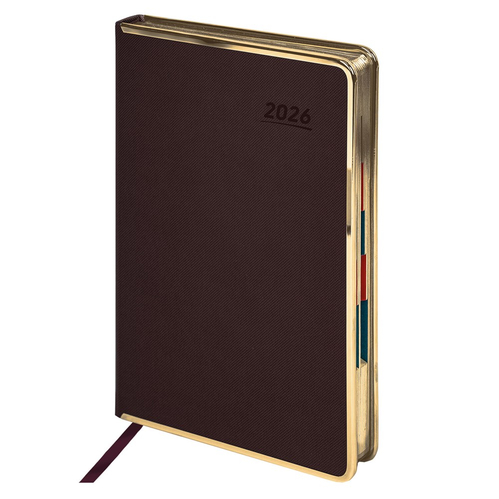 Датированный ежедневник серии "Infinity Gold" от GALANT – надежный спутник делового человека.Внутренний блок включает 168 листов тонированной бумаги цвета "слоновая кость" плотностью 70 г/м2. Каждая страничка имеет перфорированный угол. Благодаря стандартному формату А5 (148х218 мм) ежедневник удобно использовать как в офисе, так и на выездных деловых встречах. Твердая обложка темно-коричневого цвета выполнена под кожу с отделкой из металлических накладок, что увеличивает ее износоустойчивость. Срез ежедневника покрыт золотой фольгой в цвет металлических накладок, и это придает ему особый шарм. Материал обложки подходит для горячего тиснения.