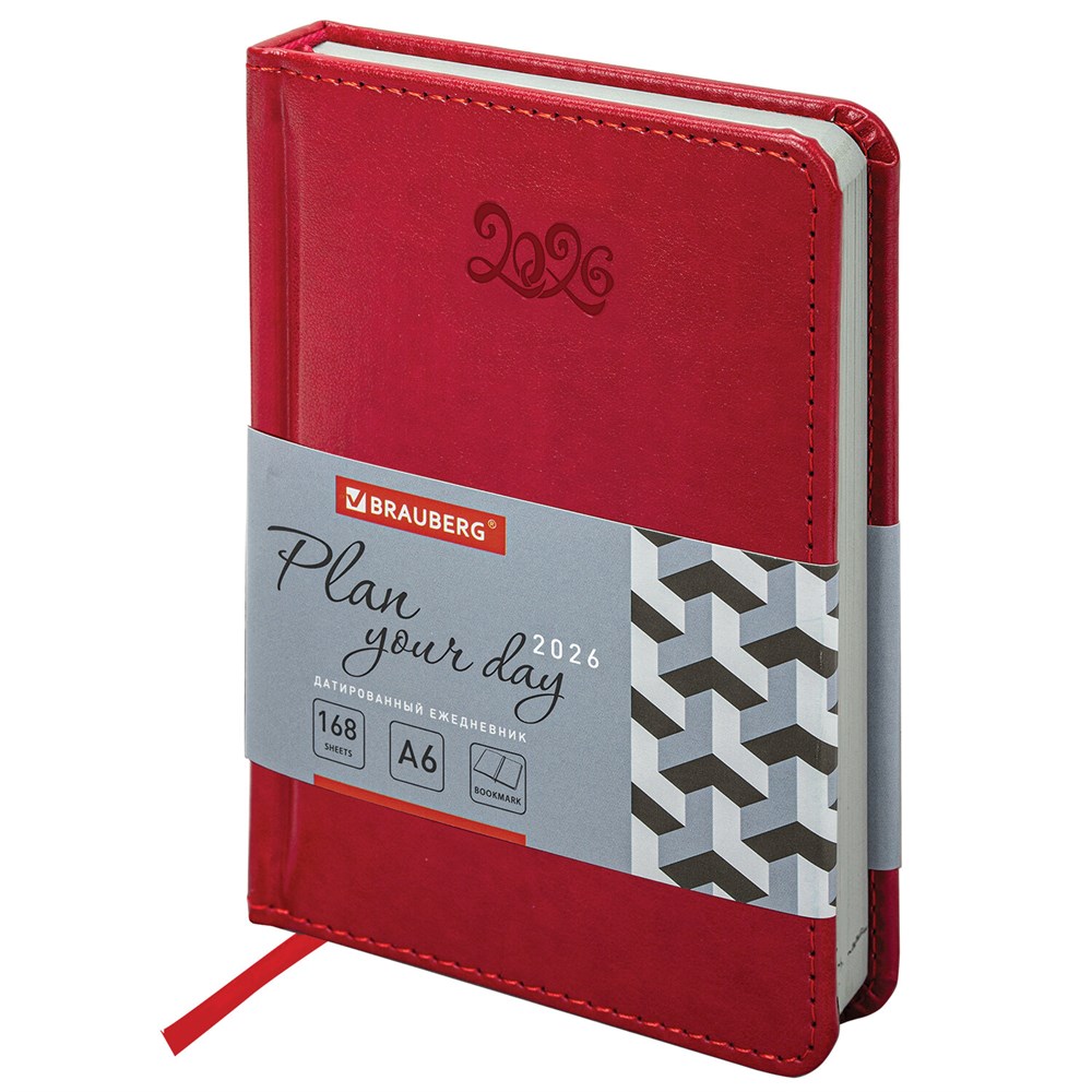 Ежедневник датированный 2026, МАЛЫЙ ФОРМАТ 100х150 мм, А6, BRAUBERG "Rainbow", под кожу, красный, 117256