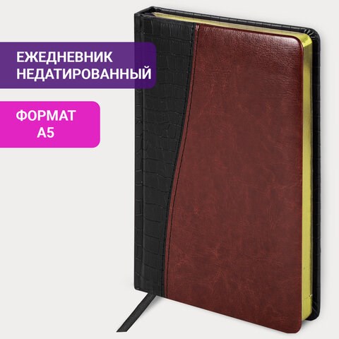 Ежедневник недатированный А5 138х213 мм BRAUBERG "Cayman" под кожу, 160 л., черный/темно-коричневый, 123399