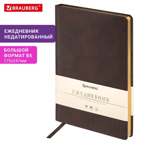 Ежедневник недатированный БОЛЬШОЙ ФОРМАТ (175х247 мм) В5, BRAUBERG "Alligator", под матовую крокод. кожу, 160л, крем.блок, т-корич, 124969