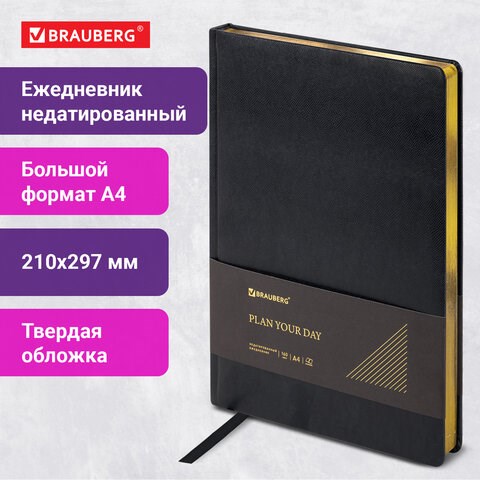 Ежедневник недатированный БОЛЬШОЙ ФОРМАТ 210х297 мм, А4, BRAUBERG "Iguana", под кожу, 160 л., черный,114452