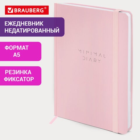 Ежедневник недатированный с резинкой А5 145х203мм, BRAUBERG, твердый, розовый, 160л, Minimal, 116301