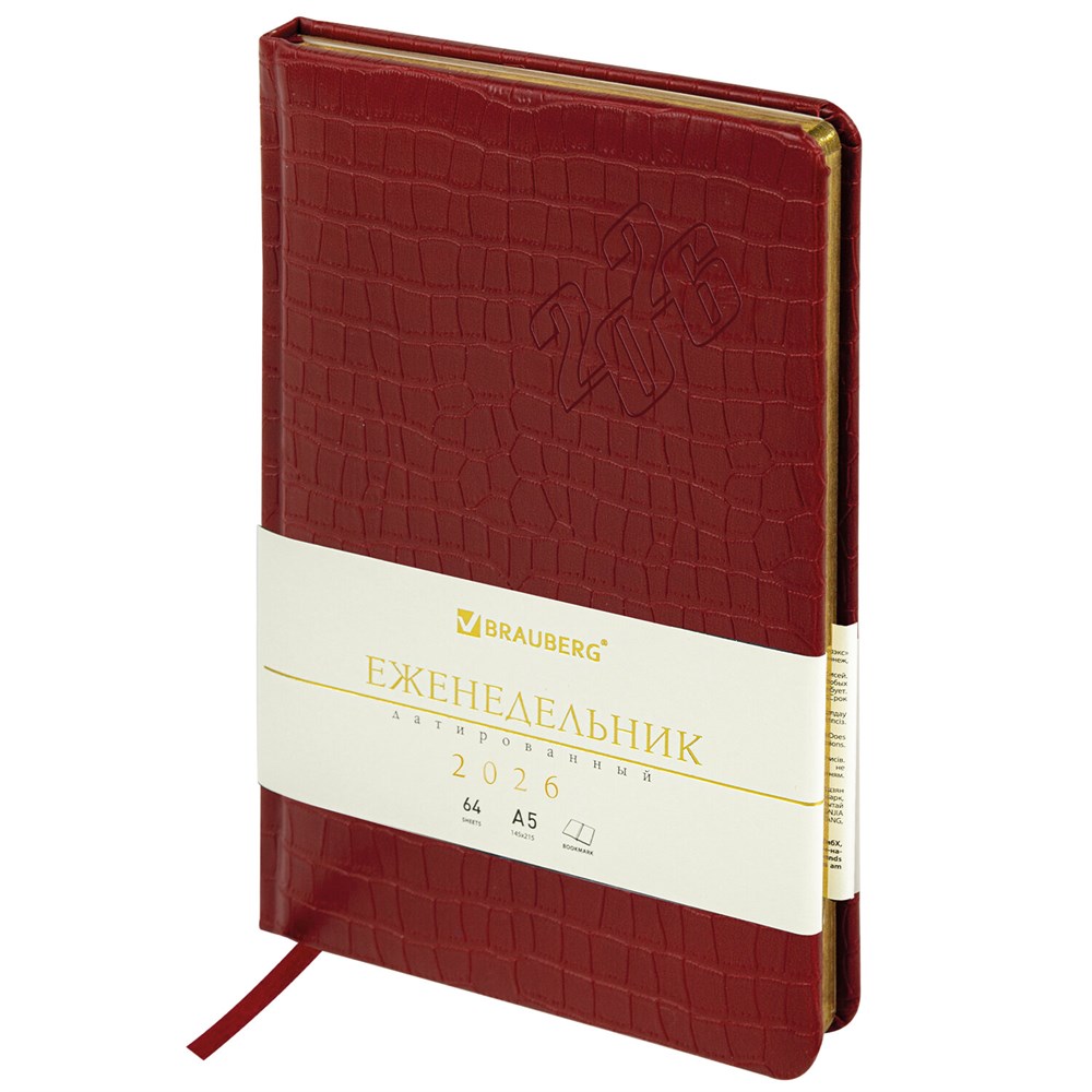 Еженедельник BRAUBERG "Comodo" – великолепная возможность прикоснуться к легендарной рептилии. Обложка, стилизованная под кожу крокодила, и насыщенный цвет делают этот деловой аксессуар изысканным.Внутренний блок включает 64 листа тонированной бумаги плотностью 70 г/м2. Благодаря стандартному формату А5 (145х215 мм) еженедельник удобно использовать как в офисе, так и на выездных деловых встречах. Твердая обложка красного цвета, стилизованная под кожу крокодила, подходит для горячего тиснения. Срез еженедельника покрыт золотой фольгой, что придает ему особый шарм.