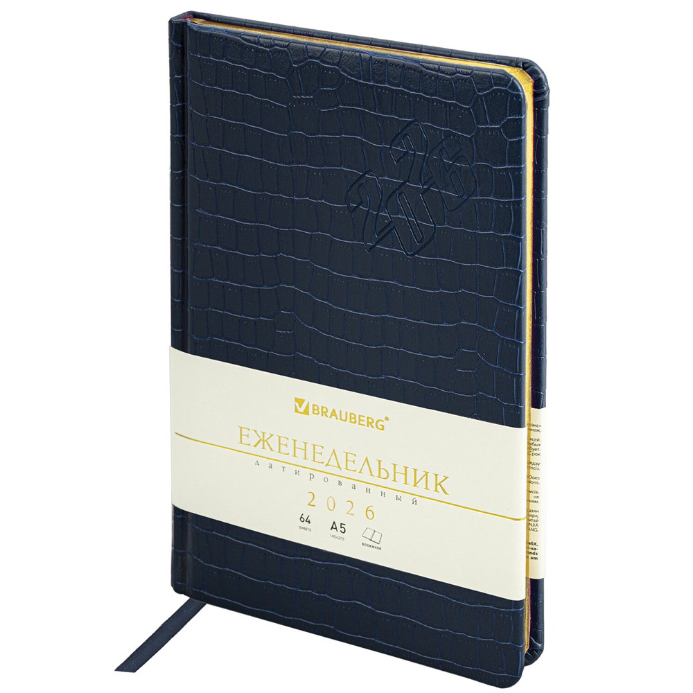 Еженедельник датированный 2026 А5 145х215 мм, BRAUBERG "Comodo", под кожу, темно-синий, 117167