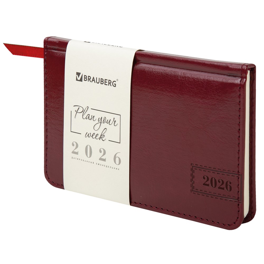 Еженедельник датированный 2026, МАЛЫЙ ФОРМАТ 95х155 мм, А6, BRAUBERG "Imperial", под кожу, бордо, 117188