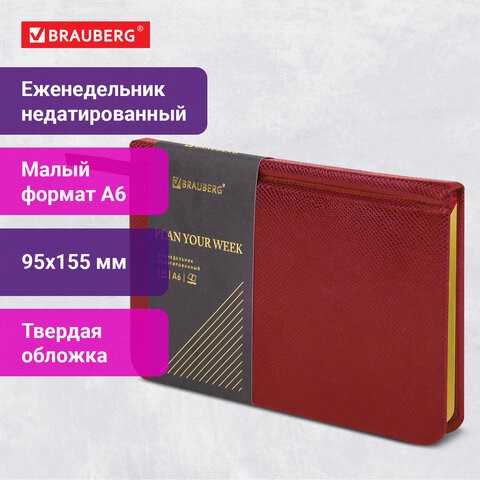Еженедельник недатированный МАЛЫЙ ФОРМАТ 95х155 мм, А6, BRAUBERG "Iguana", под кожу, 64 л., красный, 114481
