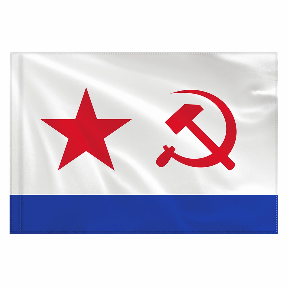 Флаг ВМФ СССР используется в качестве атрибута для военно-патриотических мероприятий, для установки в автомобиль, для декора помещений.Флаг Военно-Морского Флота СССР представляет полотно с голубой полосой, идущей вдоль нижней кромки флага. На белом полотне размещены: в центре левой половины – красная пятиконечная звезда; в центре правой половины полотна – перекрещённые серп и молот красного цвета. Яркое изображение с двух сторон флага.