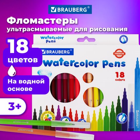 )Набор ультрасмываемых BRAUBERG «PREMIUM» с насыщенными, яркими цветами в количестве 18 штук. Чернила на водной основе практически не имеют запаха, не токсичны и легко смываются с большинства материалов и тканей.