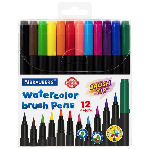 )Фломастеры BRAUBERG PREMIUM - набор из 12 круглых фломастеров с наконечником-кистью, смываемыми чернилами на водной основе в ПВХ-упаковке для рисования.