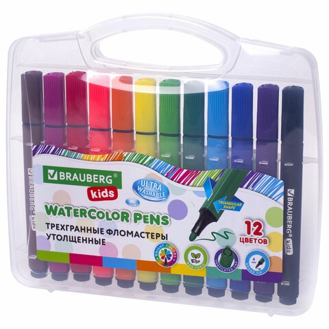)Фломастеры BRAUBERG KIDS - набор из 12 утолщенных трехгранных фломастеров со смываемыми чернилами в пластиковом кейсе для рисования.