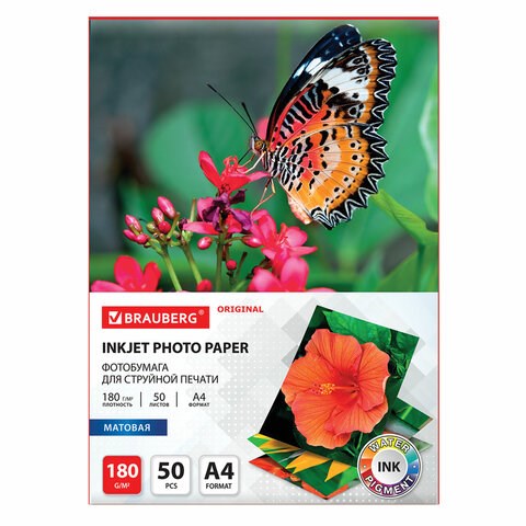 Фотобумага матовая, А4, 180 г/м2, односторонняя, 50 листов, BRAUBERG ORIGINAL, 363987
