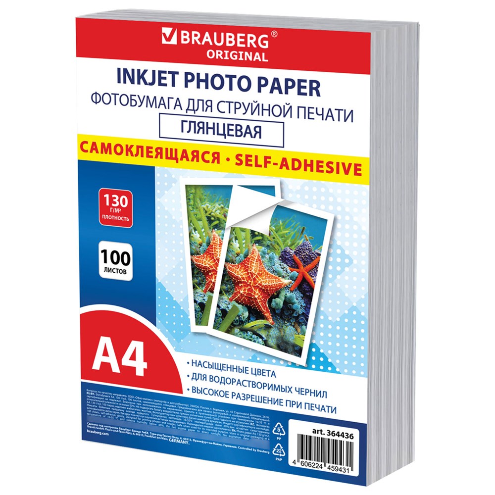 Фотобумага САМОКЛЕЯЩАЯСЯ глянцевая, А4, 130 г/м2, 100 листов, ПАКЕТ, BRAUBERG ORIGINAL, 364436