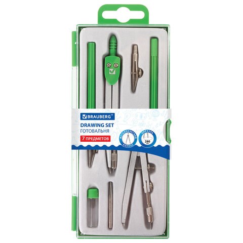 Готовальня BRAUBERG "Klasse", 7 предметов: циркуль+кронциркуль, рейсфедер + держатель, 2 вставки, грифель, 210344