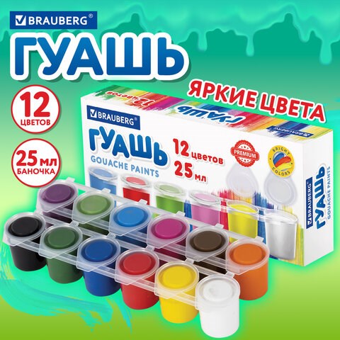Гуашь BRAUBERG "PREMIUM", 12 цветов по 25 мл, 191700