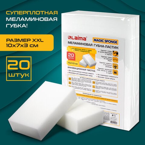 Губка-ластик МЕЛАМИНОВАЯ для удаления пятен, для чистки кухни, уборки, обуви, 10х7х3 см, КОМПЛЕКТ 20 шт., полибэг, LAIMA, 608955.
