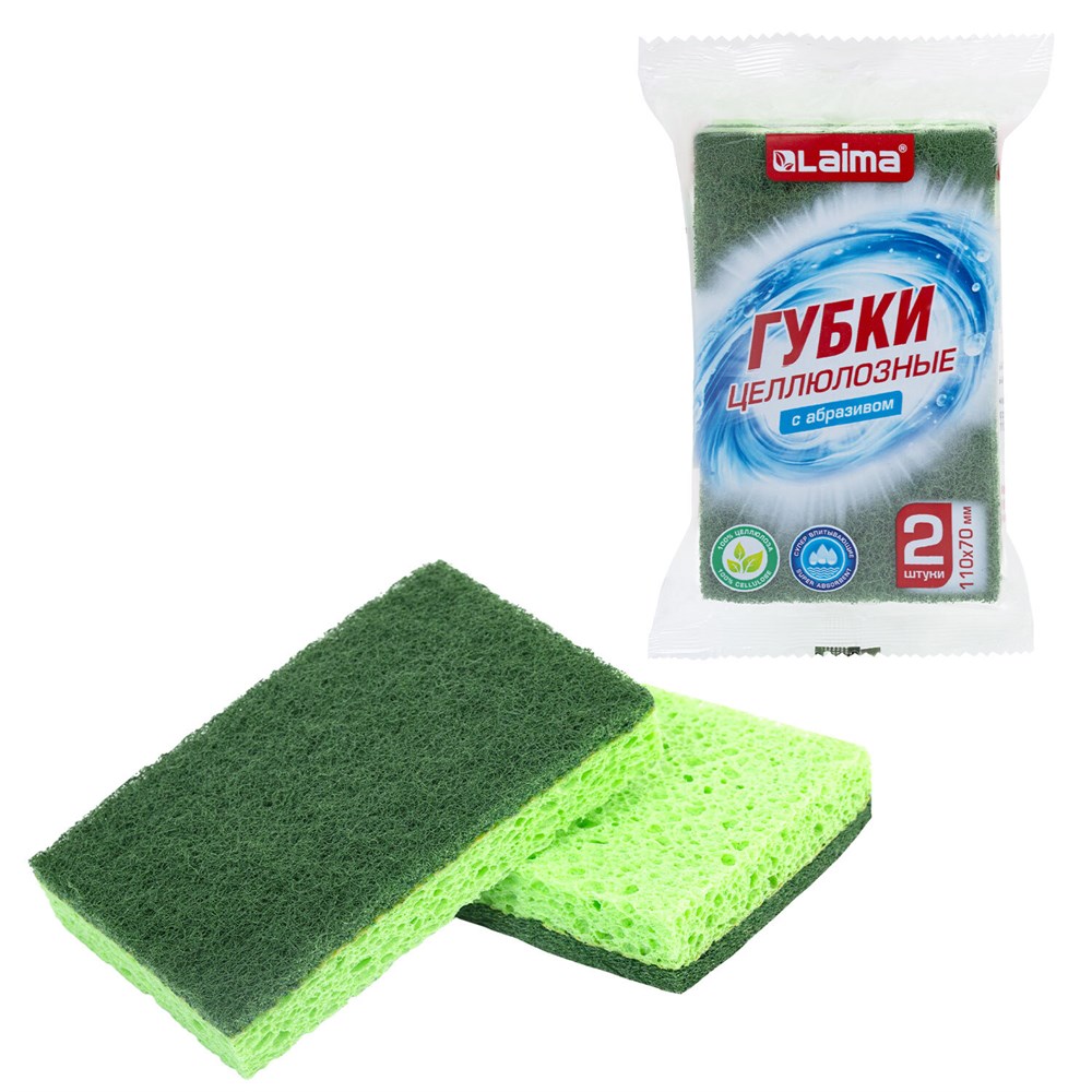 Губки для посуды 110х70х20 мм, ЦЕЛЛЮЛОЗНЫЕ + АБРАЗИВ, КОМПЛЕКТ 2 штуки, зеленые/зеленый абразив, LAIMA, 700258