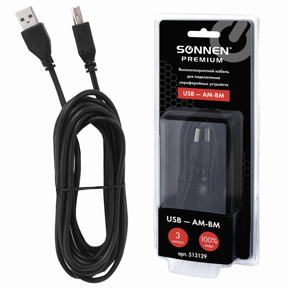 Кабель USB 2.0 AM-BM, 3 м, SONNEN Premium, медь, для подключения принтеров, сканеров, МФУ, плоттеров, экранированный, черный, 513129