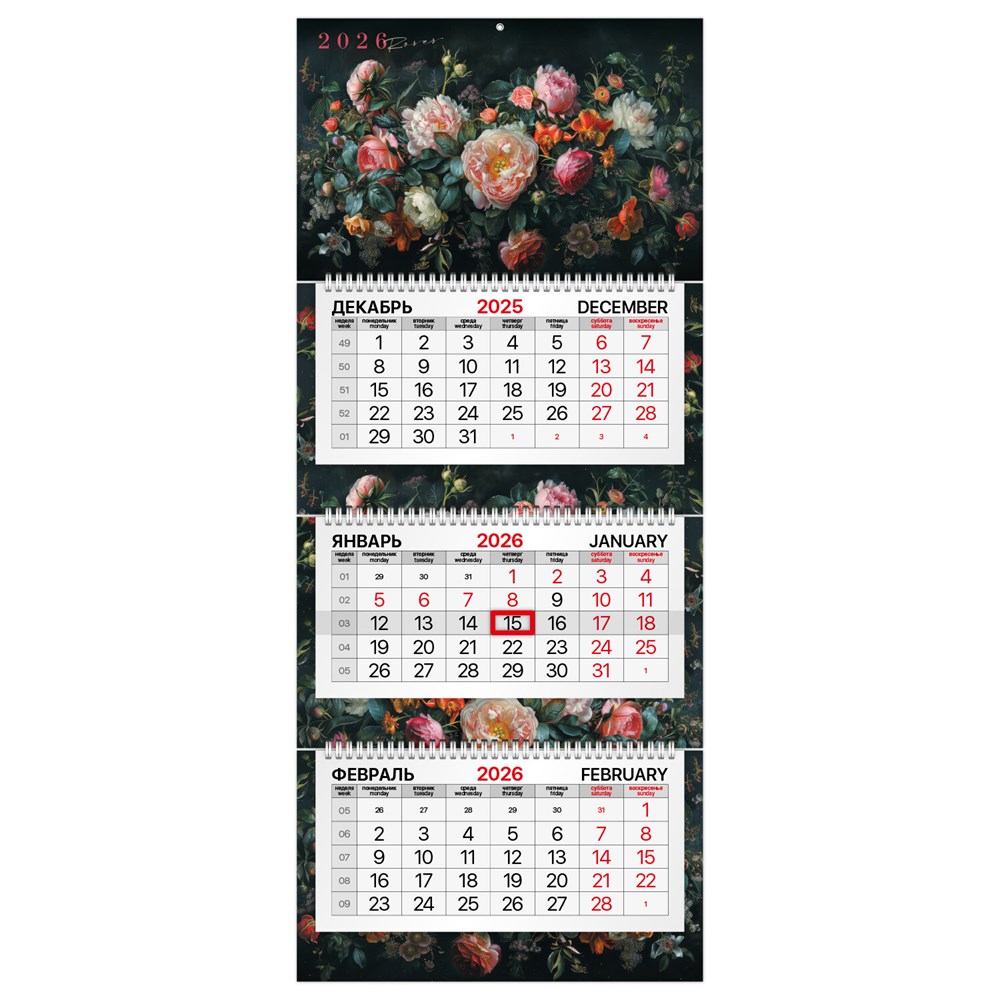 Календарь квартальный 2026 г., 3 блока, 3 гребня, бегунок, мелованная бумага, BRAUBERG PREMIUM, "Цветы", 116831