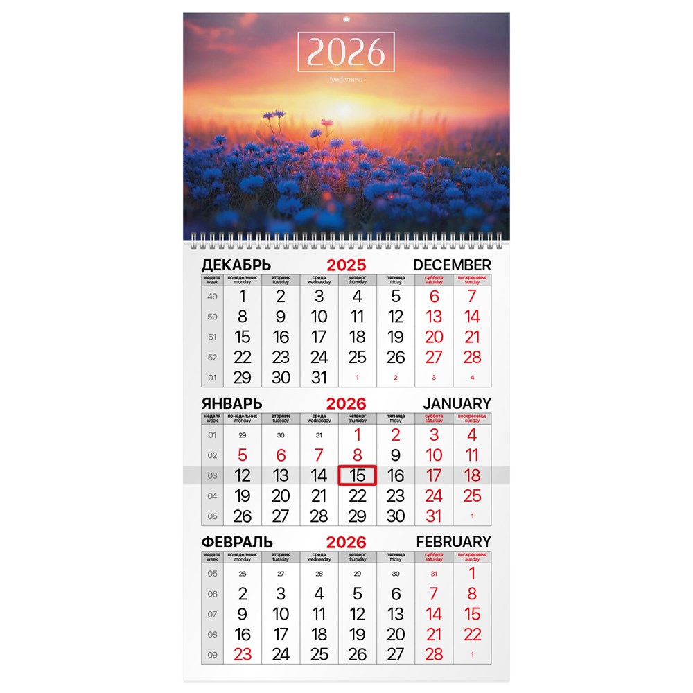 Календарь квартальный на 2026 г., 1 блок, 1 гребень, бегунок, мелованная бумага, BRAUBERG, "Васильковый луг", 116751