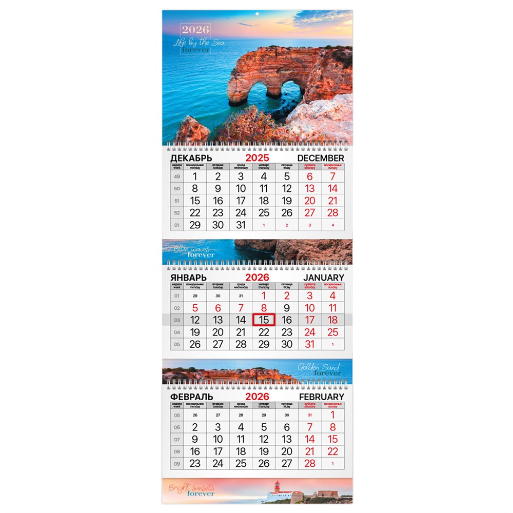 Календарь квартальный на 2026 г., 3 блока, 3 гребня, бегунок, мелованная бумага, BRAUBERG EXTRA, "Южный берег", 116817