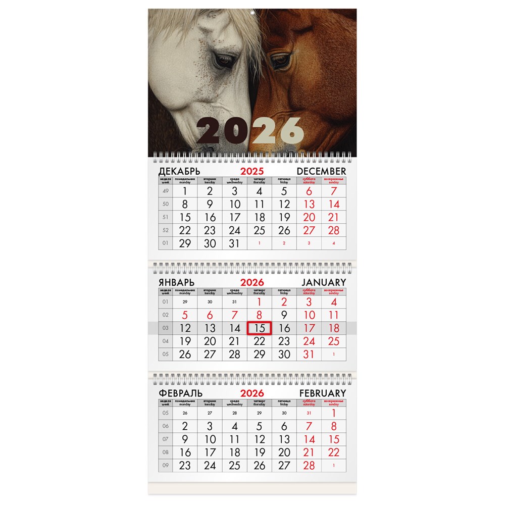 Квартальный календарь BRAUBERG "Лошади" предназначен для делового планирования.Офисный календарь на 2026 год на 3 гребнях. Для удобства планирования состоит из 3 блоков с календарными сетками на три месяца – предыдущий, текущий и следующий.