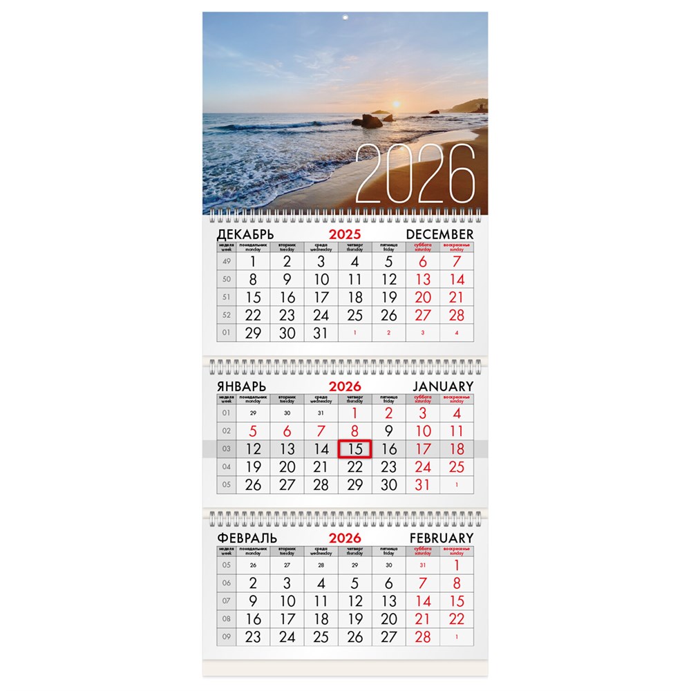 Квартальный календарь BRAUBERG "Морской пейзаж" предназначен для делового планирования.Офисный календарь на 2026 год на 3 гребнях. Для удобства планирования состоит из 3 блоков с календарными сетками на три месяца – предыдущий, текущий и следующий.