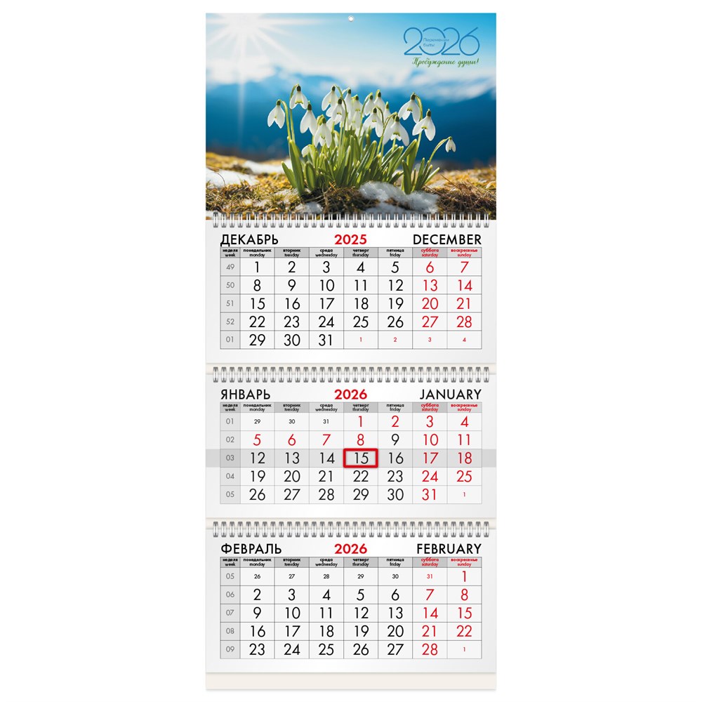 Календарь квартальный на 2026 г., 3 блока, 3 гребня, бегунок, офсет, BRAUBERG, "Подснежники", 116778