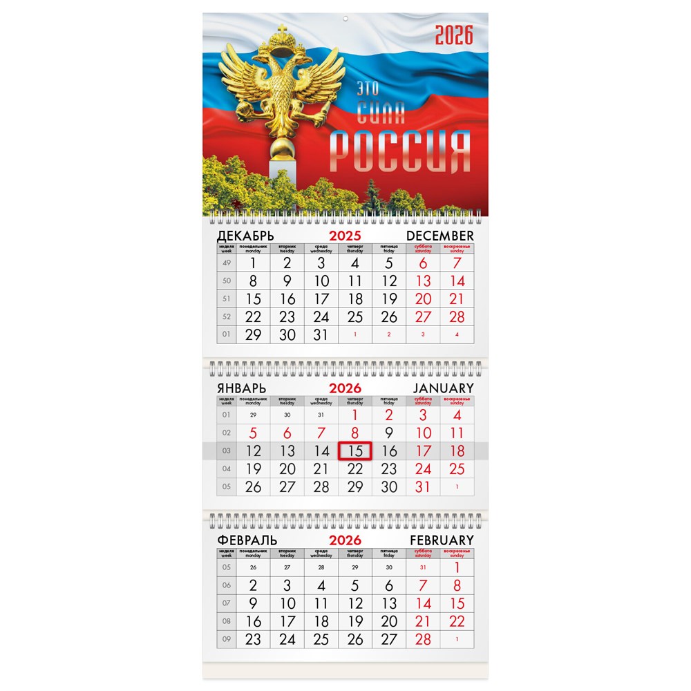 Квартальный календарь BRAUBERG "Символика РФ2" предназначен для делового планирования.Офисный календарь на 2026 год на 3 гребнях. Состоит из 3 блоков с календарными сетками на три месяца – предыдущий, текущий и последующий. Блок календаря напечатан на офсетной бумаге плотностью 65 г/м2. Подложка изготовлена из мелованного картона плотностью 235 г/м2. Курсор-бегунок выделяет текущую дату. Вертикальный формат.