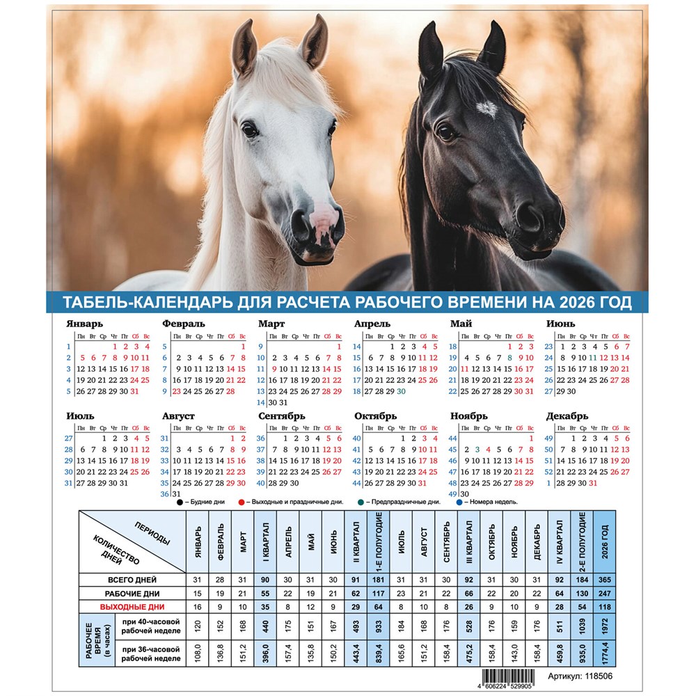 Календарь-табель на 2026 год с рабочими и выходными днями, А4 (195х225 мм), STAFF, Символ года, 118506