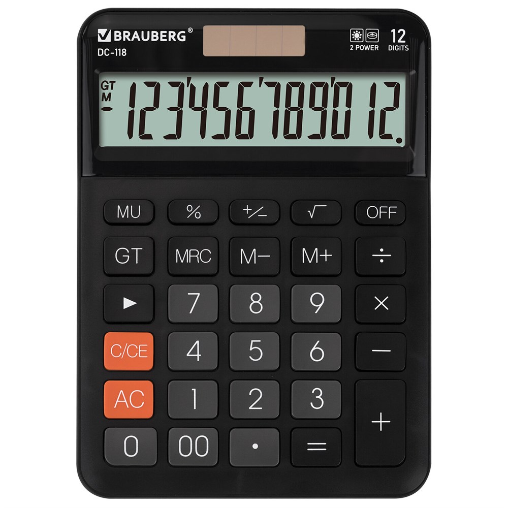 Настольный калькулятор BRAUBERG DC-118 сочетает стильный дизайн, устойчивый корпус и большие округлые кнопки для удобного ввода. Оснащение солнечной батареей делает его надежным помощником в офисе, школе и дома.Калькулятор выполняет все основные арифметические действия, вычисления с процентами, извлечение квадратного корня и расчёт наценки (MU). Удобен в работе благодаря клавишам корректировки числа, "00" и "GT" (общее суммирование), а также кнопкам для работы с памятью.