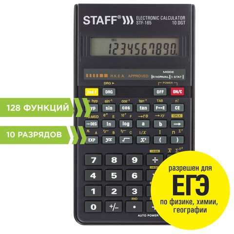 )Непрограммируемый инженерный калькулятор STAFF STF-165 выполняет все основные вычисления, которые понадобятся школьникам на экзаменах и контрольных работах. Сертифицирован для использования на ЕГЭ и ОГЭ по физике, химии, географии и ОГЭ по биологии.