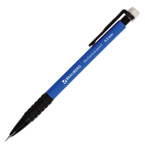 Механический карандаш BRAUBERG «Comfort» с корпусом синего цвета и и удобным резиновым упором, исключающим скольжение пальцев во время письма.