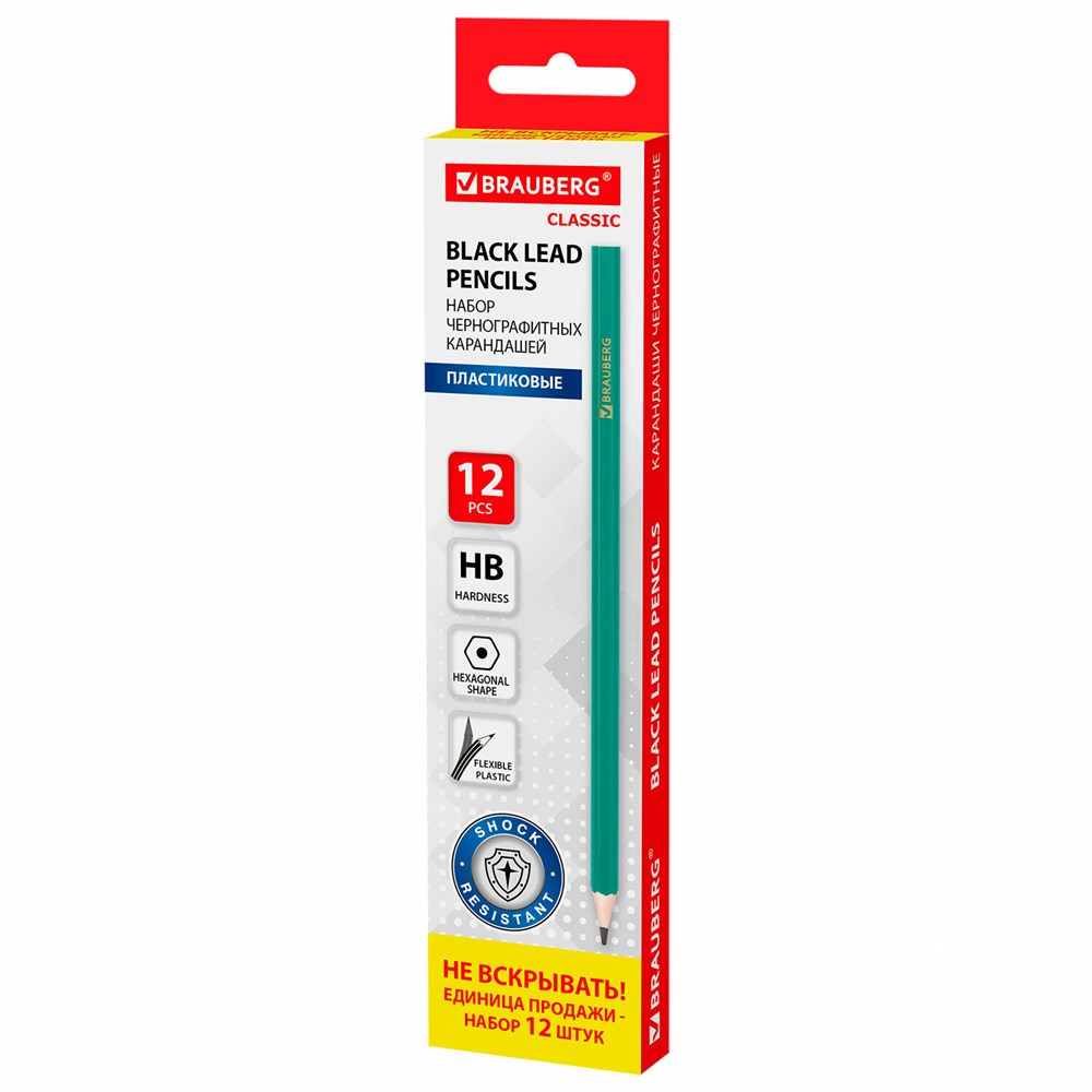 Карандаши чернографитные BRAUBERG НАБОР 12 шт., НВ, без резинки, пластиковый зеленый корпус, 180677