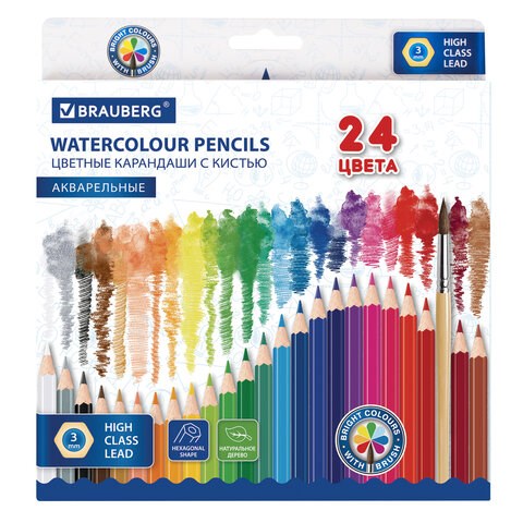 Карандаши цветные акварельные BRAUBERG 24 цвета с КИСТЬЮ, шестигранные, грифель 3 мм, натуральное дерево, 181849