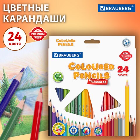 Карандаши цветные BRAUBERG PREMIUM, 24 цвета, трехгранные, грифель 3 мм, 181663