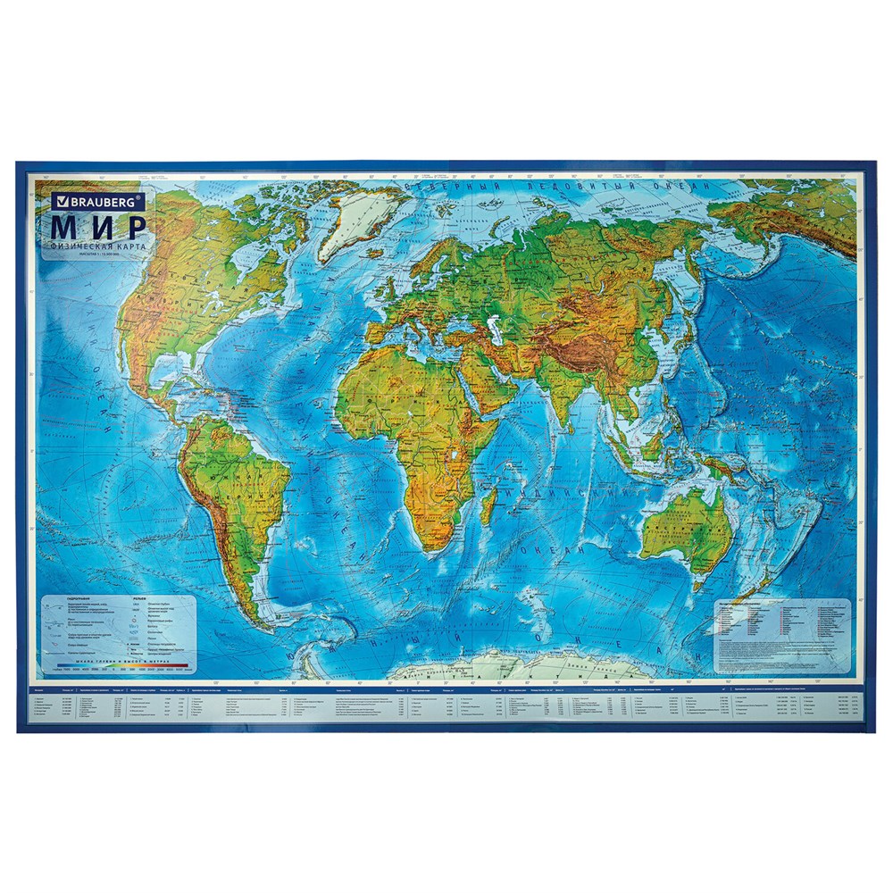 Карта мира физическая 199х134 см, 1:15,5М, с ламинацией, интерактивная, в тубусе, BRAUBERG, 112389