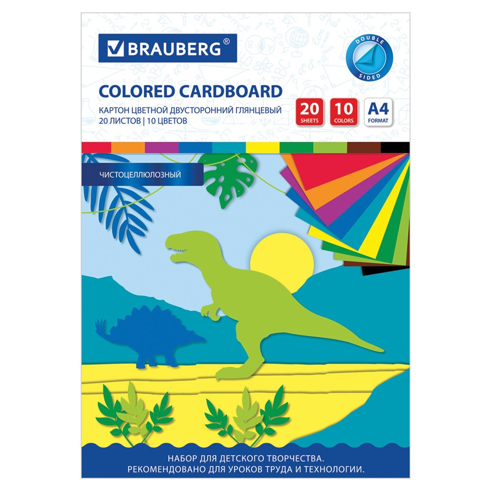 Картон цветной А4 2-сторонний МЕЛОВАННЫЙ, 20 листов, 10 цветов, в папке, BRAUBERG, 200х290 мм, 113554