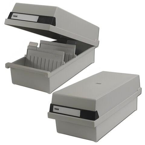 Картотека пластиковая ФОРМАТ А6 (148х105 мм) горизонтальная на 1300 карт, с крышкой, серая, HAN (Германия), НА956/11