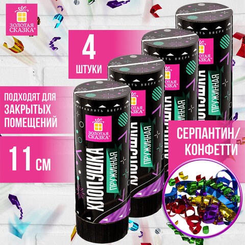 Хлопушка пружинная ЗОЛОТАЯ СКАЗКА НАБОР 4 шт., 11 см, фольга, серпантин/конфетти, ассорти, 591469
