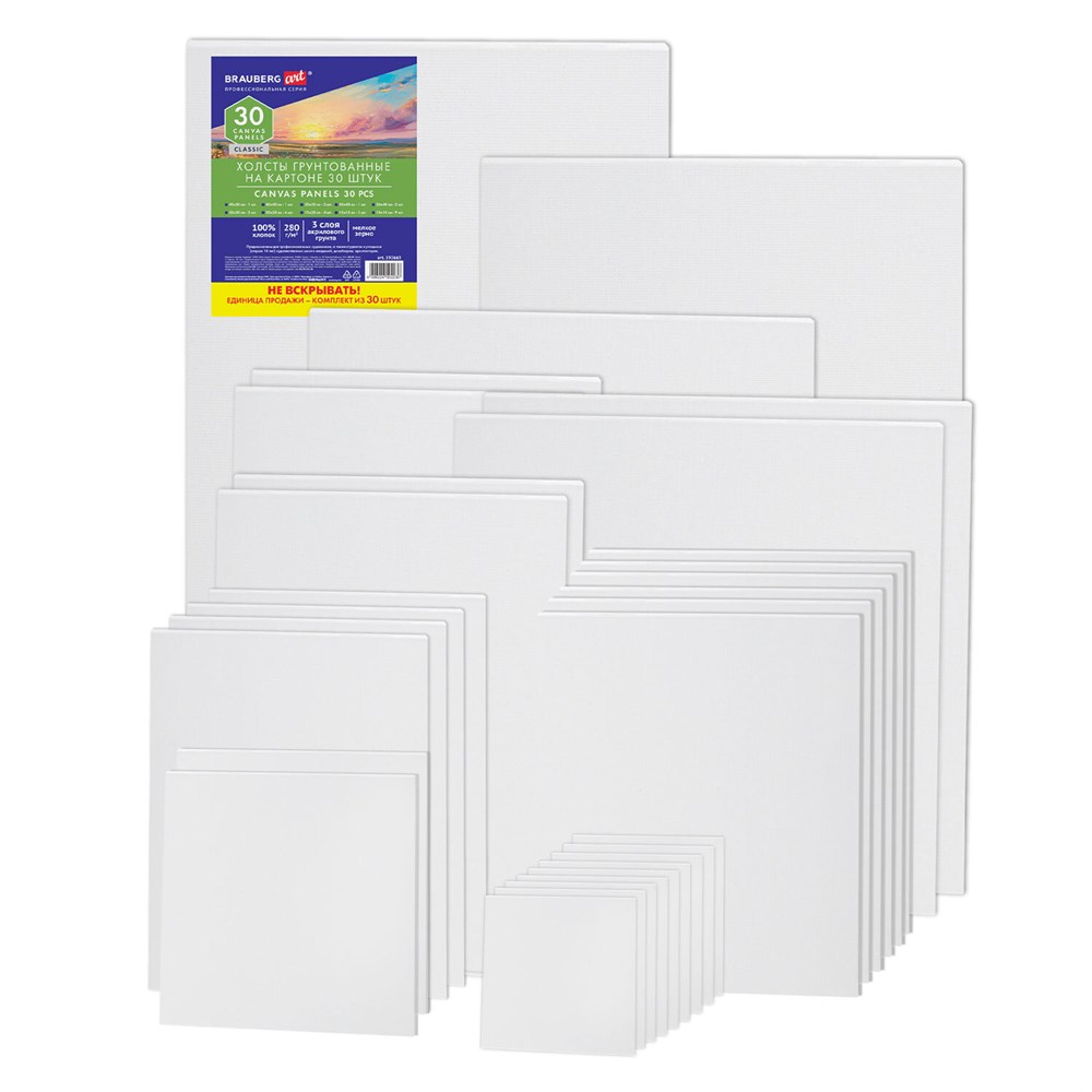 Холсты на картоне НАБОР 30 штук в коробе, хлопок, грунт, 280 г/м2, BRAUBERG ART CLASSIC, 192663